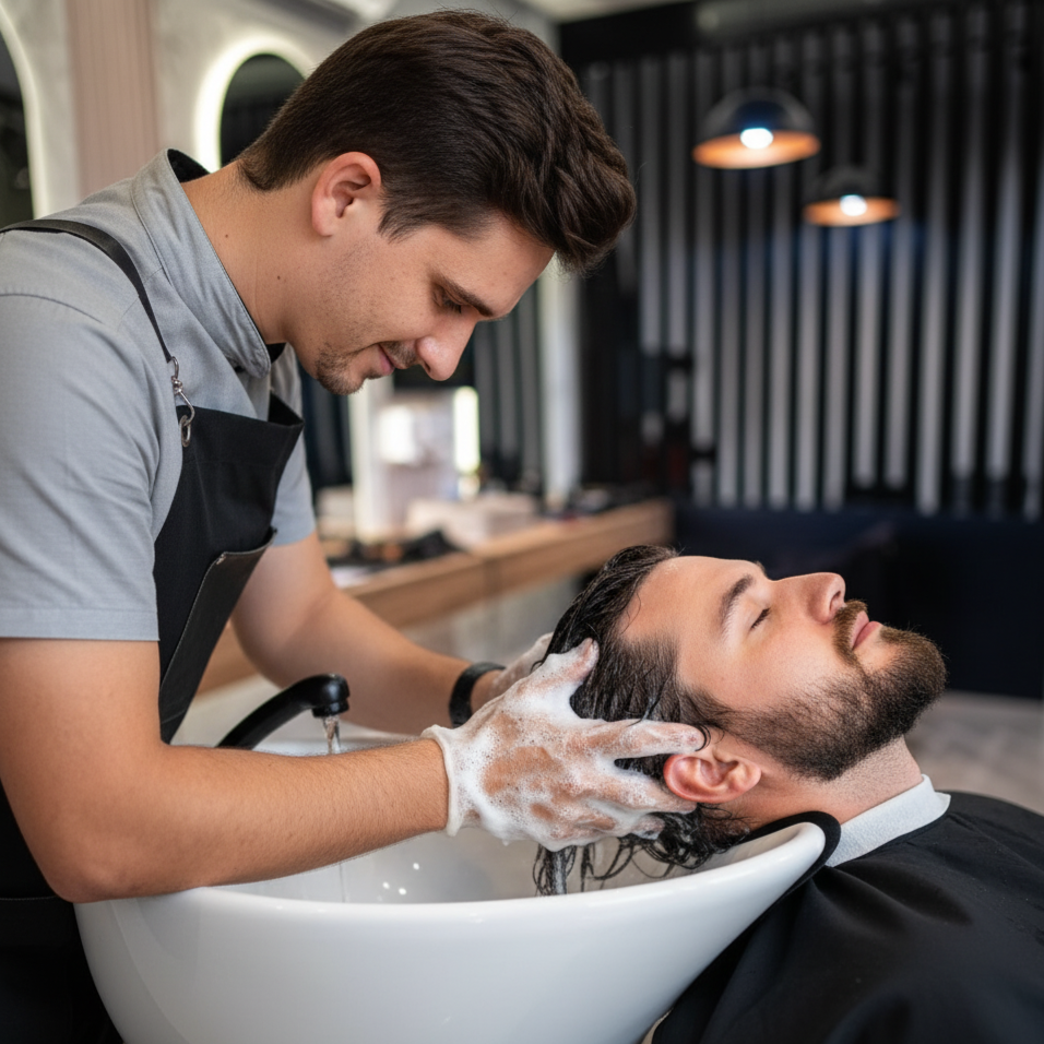 A lavagem na barbearia é diferente da de casa. Usamos produtos de linha profissional que tratam o cabelo, removem resíduos de produtos (como pomadas e ceras) e controlam a oleosidade, permitindo que o barbeiro tenha uma visão clara para um corte mais preciso.